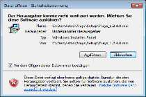 (2.) go to the window showing the security warning (see screenshot, left): clicking „Run“ will appear: